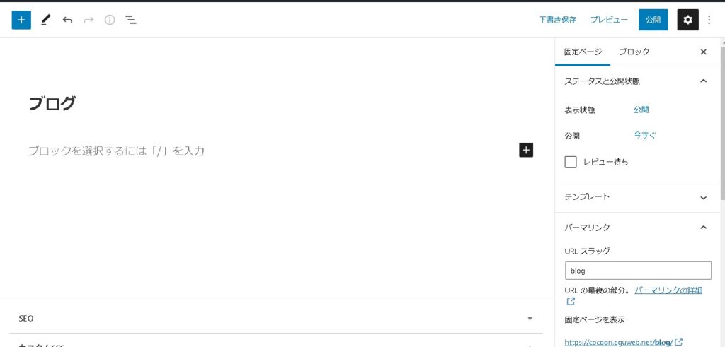 ページタイトルは「ブログ」「投稿一覧」といったタイトルにしておきます。見て分かれば何でも大丈夫です。URLスラッグは分かりやすいように「blog」などにしておきましょう(カテゴリのURLスラッグと重複しないように注意が必要です)。