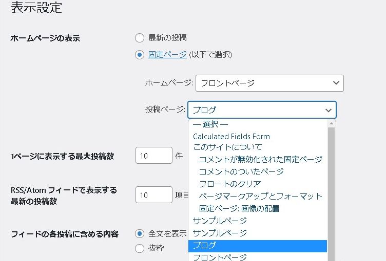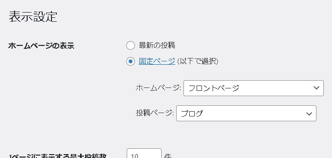 「設定」>「表示設定」を開きます。投稿ページに先程設定したブログという名称のページを設定します。