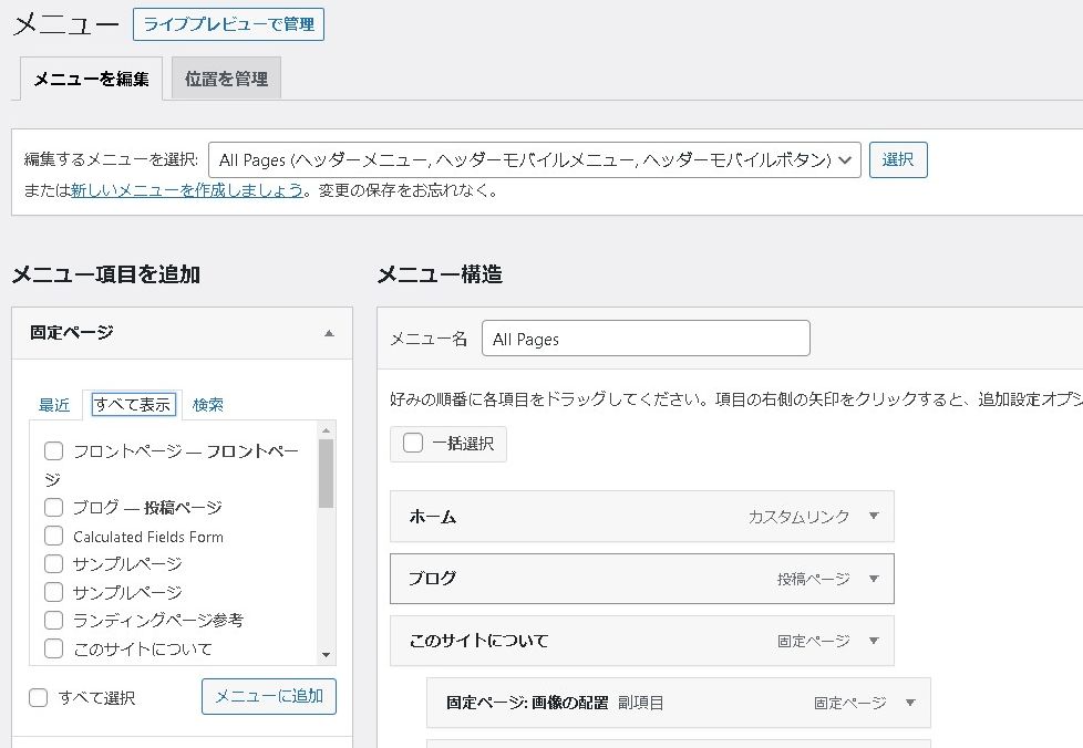 このままだとページが開けないので、先程作成した固定ページ「ブログ」をメニューに追加します。