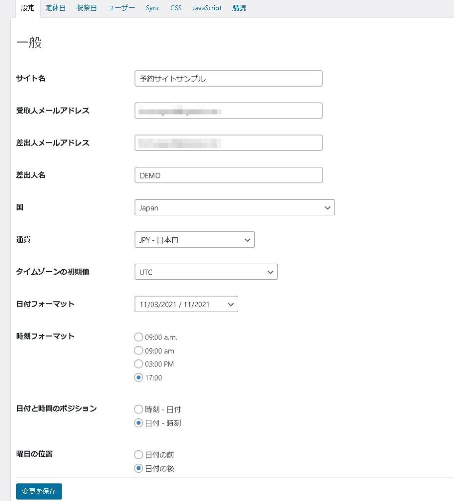 サイト名やメールアドレス、国、通貨といった設定ができます。