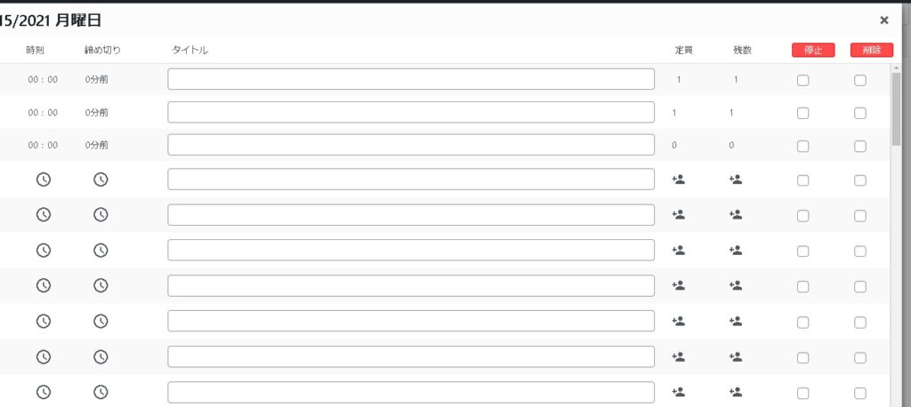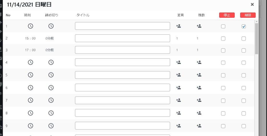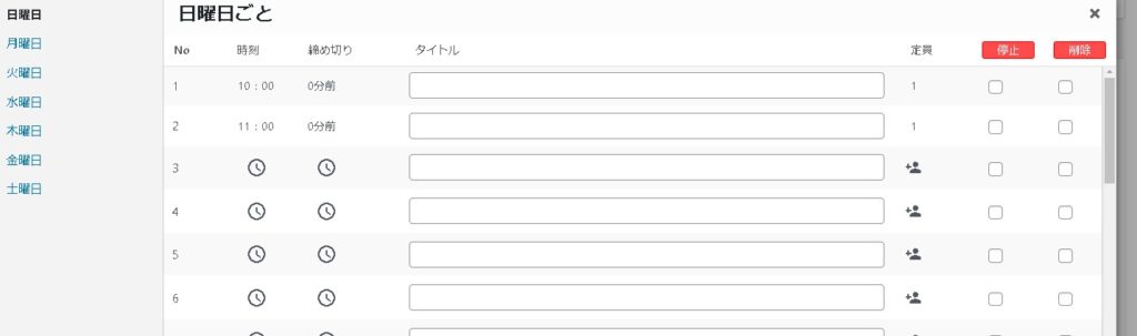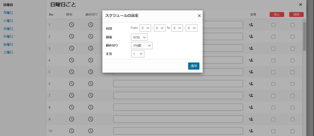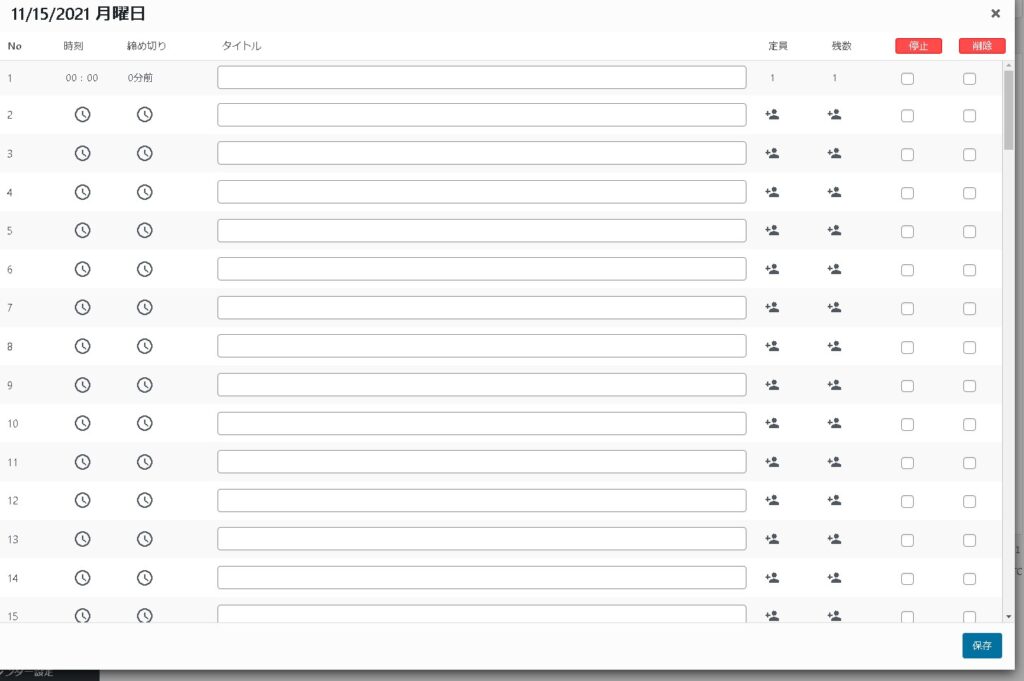 カレンダーの日付をクリックすると、時間ごとの受付可否、定員などの設定が可能です。