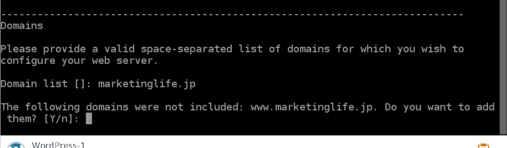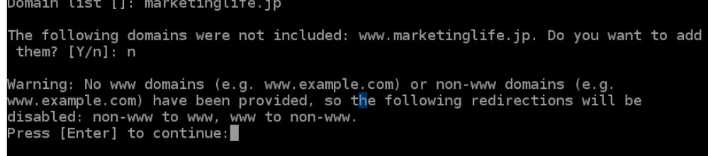 次のドメインは含まれていません:www.marketinglife.jp。 それらを追加しますか? [Y / n]:n