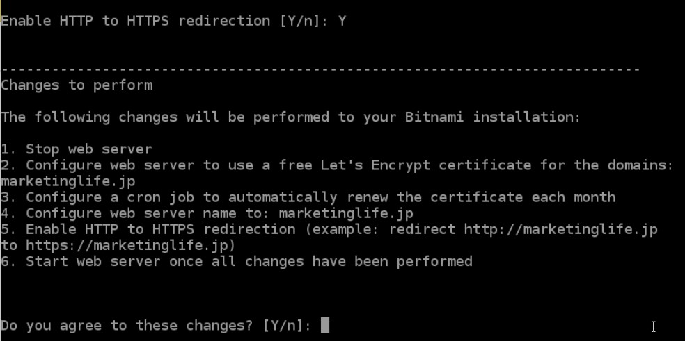 一時的にWebサーバーが止まったり、リダイレクトが有効になったりしますよ…という説明が書かれています。内容を確認したらYを入れてEnterします。