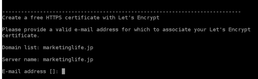 再度、bncert-toolを実行すると、「ドメイン Webサーバーを構成するドメインの有効なスペース区切りのリストを提供してください。ドメインリスト[]:」と聞かれます。