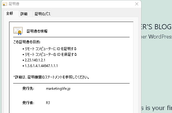 と、表示されました。SSL証明書のインストールに成功したようです。
