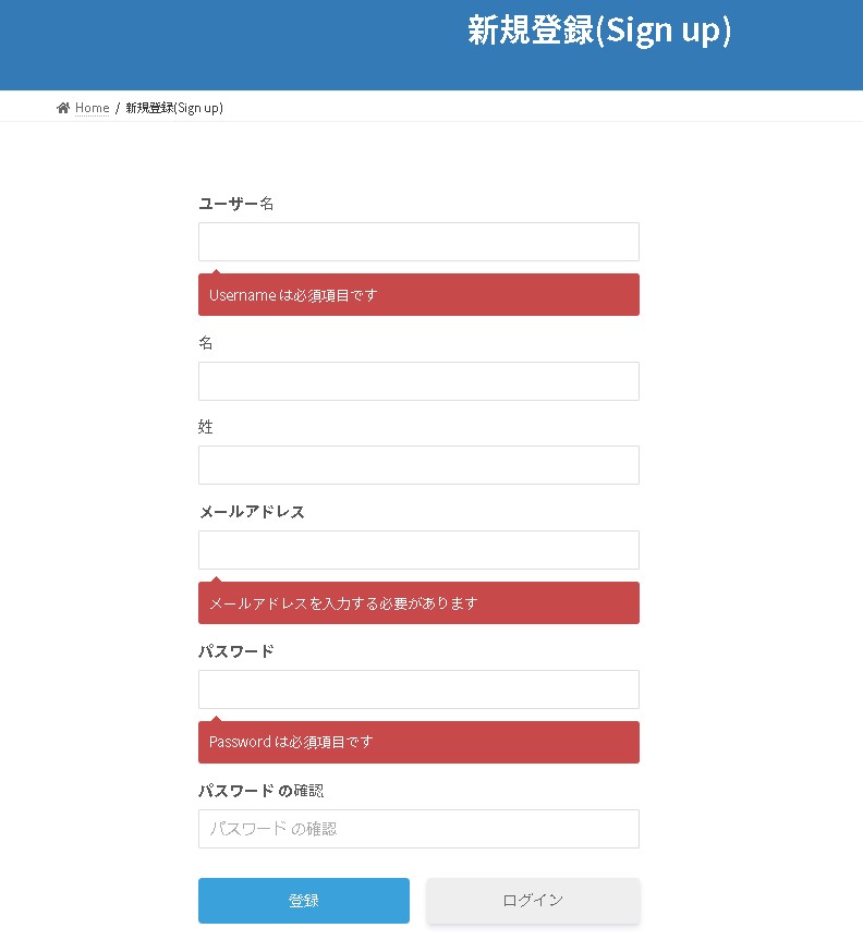 テンプレートで作成されている新規登録ページを開くと、ワードプレスのユーザー登録画面と同じような入力項目があります。