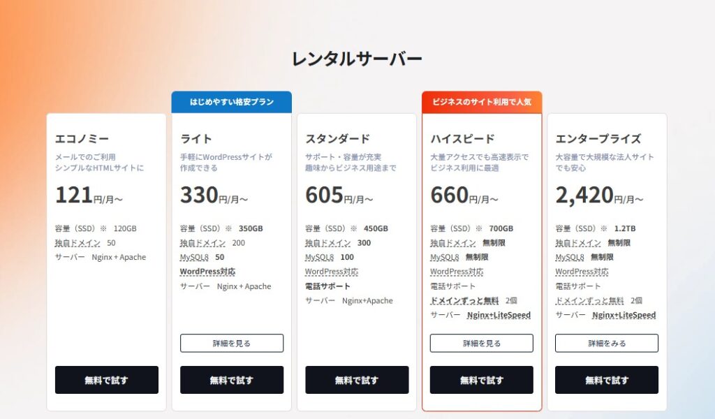 ライトプランにはデータベースが1つまでといった制限もあるので、サイトを複数作る場合は「スタンダードプラン」、または速度も安定していて、容量もある最高速表示の「ハイスピードプラン」がオススメです(ロリポップ推奨)。