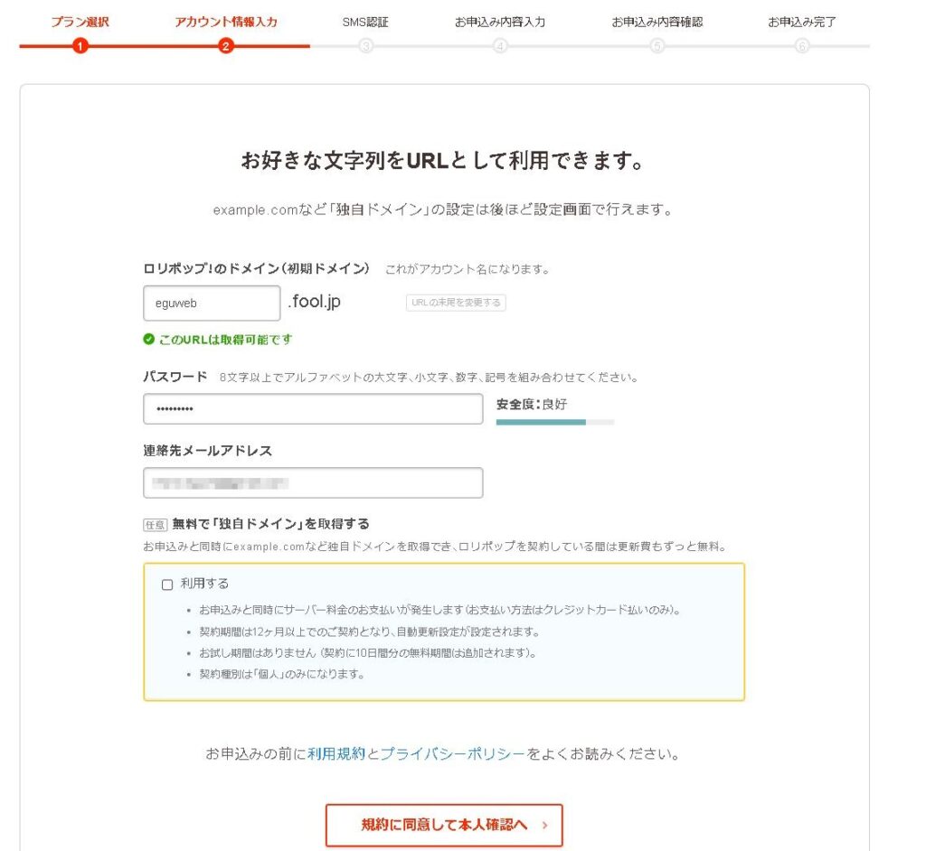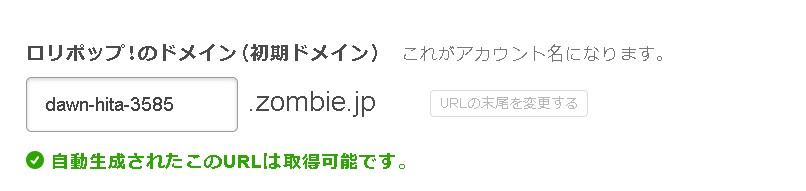 まずは、ロリポップの管理画面にログインするための初期ドメインと呼ばれるものの設定を行います。.fool.jpなどの末尾部分は固定されますが、左側は自由に選択できます。ログインする際に使いますので忘れないようにしましょう。※基本的には自動生成された初期ドメインのままでOKです。