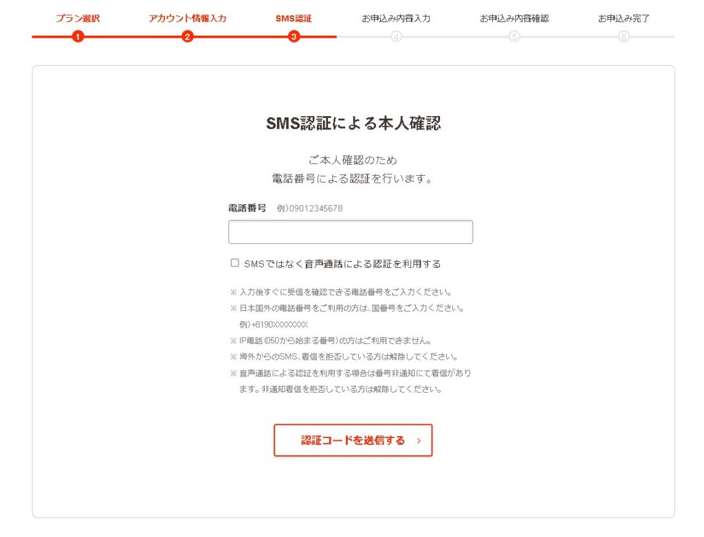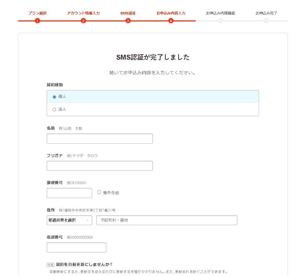 SMS認証が無事に完了したら、続いてお申し込み内容を入力します。