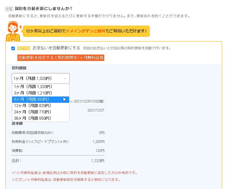 解約する予定がなければ、期間を長目に設定した方がお安くなります。36ヶ月にするとハイスピードプランでも月々550円となります。もし短目にする場合は6ヶ月~12ヶ月あたりを選択しておくと月々1000円を切るのでお得です。