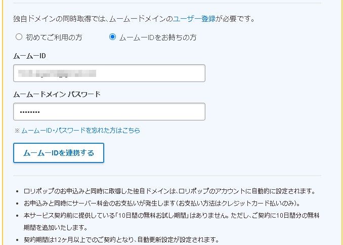 過去にムームードメインのアカウントを作ったことがある場合は「ムームーIDをお持ちの方」からログインのアカウントを設定します。「メールアドレス」と「パスワード」を入力して「ムームーIDを連携する」を押します。
