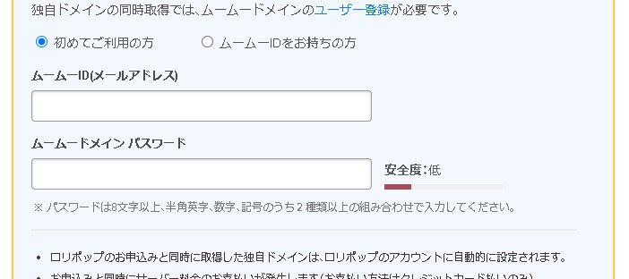 ムームードメインのユーザー登録をしていない場合は「始めてご利用の方」からメールアドレスとパスワードを設定して、ムームードメインのアカウントを取得しましょう。
