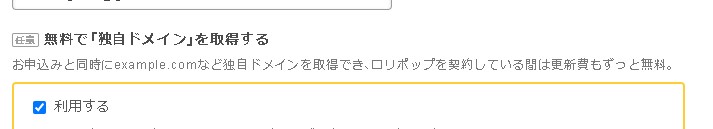 今から始めるという方はムームードメインで取得できる独自ドメインも一緒に設定しておきましょう。お申込みと同時にexample.comなど独自ドメインを取得できて、ロリポップを契約している間は更新費もずっと無料となっていてお得です。