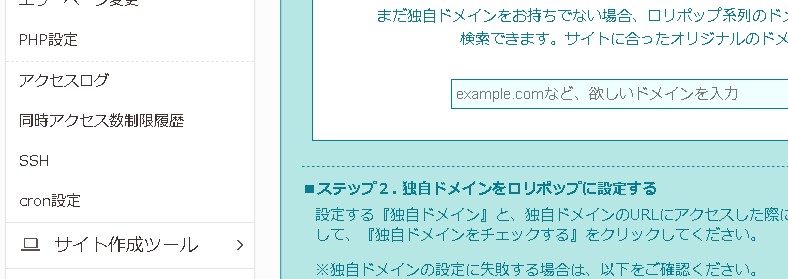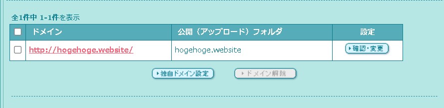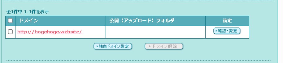 「独自ドメイン設定」を開くと、契約したドメインが表示されます。
