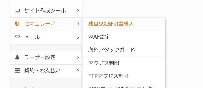 ドメインを設定したら、次に「独自SSL証明書」を導入しましょう。「セキュリティ」>「独自SSL証明書導入」から導入できます。