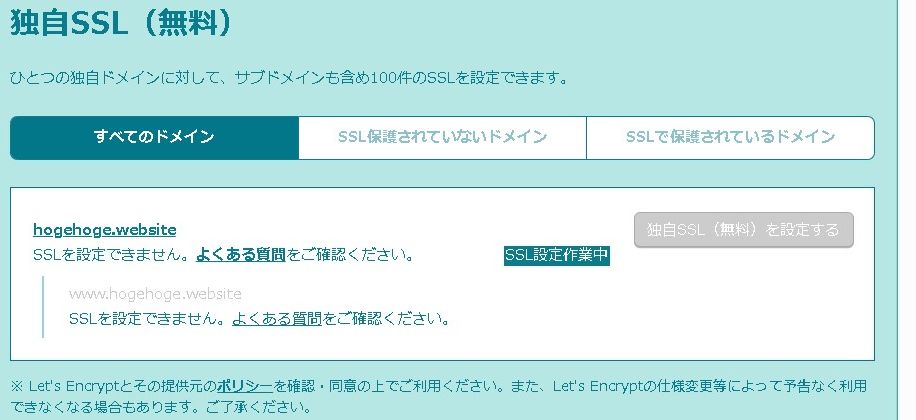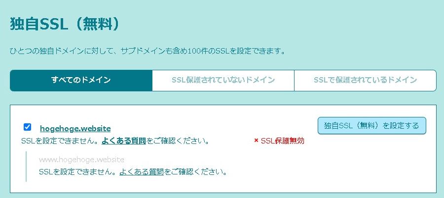 証明書を取得したいドメインにチェックを入れて「独自SSL(無料)を設定する」を押します。