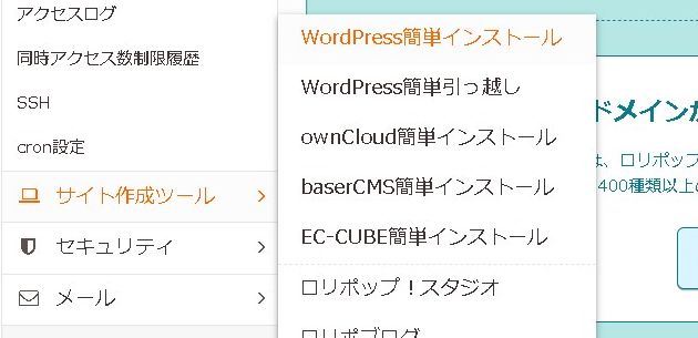 ここまできたら、あと一息です。ワードプレスのインストールを行います。「サイト作成ツール」>「WordPress簡単インストール」に進みます。
