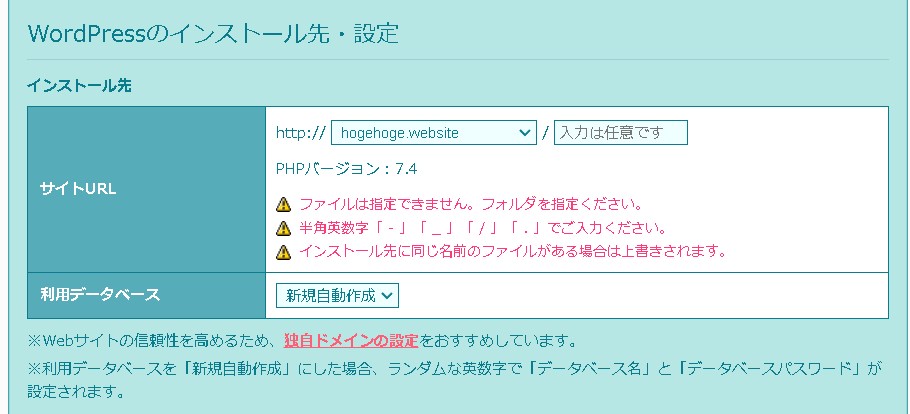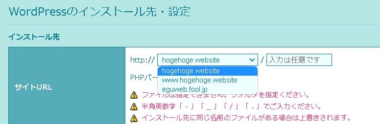 ここで選択するドメイン選択を間違えると、ワードプレスが初期化されたりしてしまいますので、選択はくれぐれも注意しましょう。