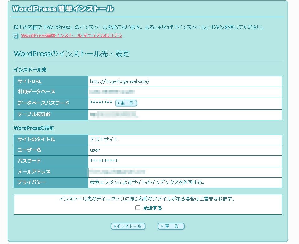 サイトURLやユーザー名など、間違いがなければ「承諾する」を押して「インストール」を押します。
