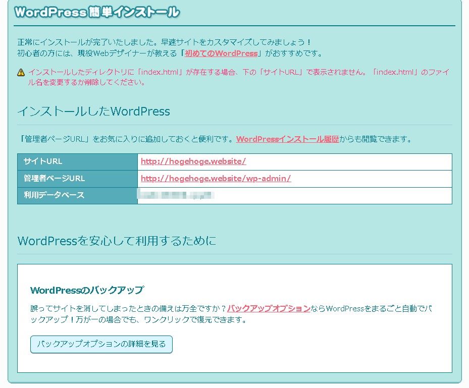 インストールを押してしばらく待つと、「正常にインストールが完了いたしました。早速サイトをカスタマイズしてみましょう!」と表示されます。これで無事にインストールが完了しました。