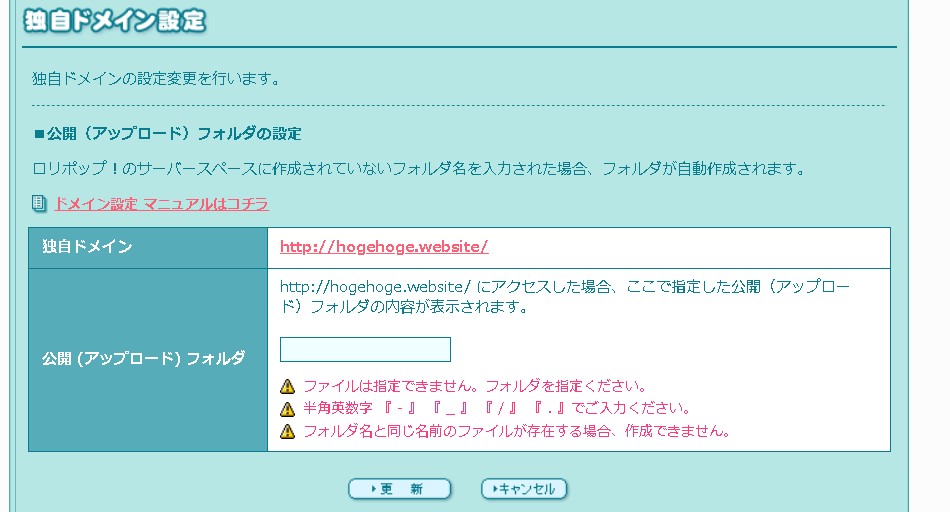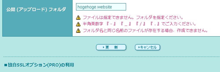 公開 (アップロード) フォルダは、基本的には取得したドメインと同じ文字列を入れておくのが分かりやすいかと思いますので、入れておきます。