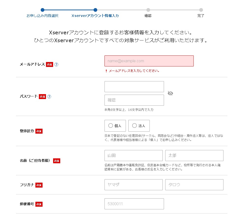 Xserverアカウントに登録するお客様情報を入力して全て埋めます。