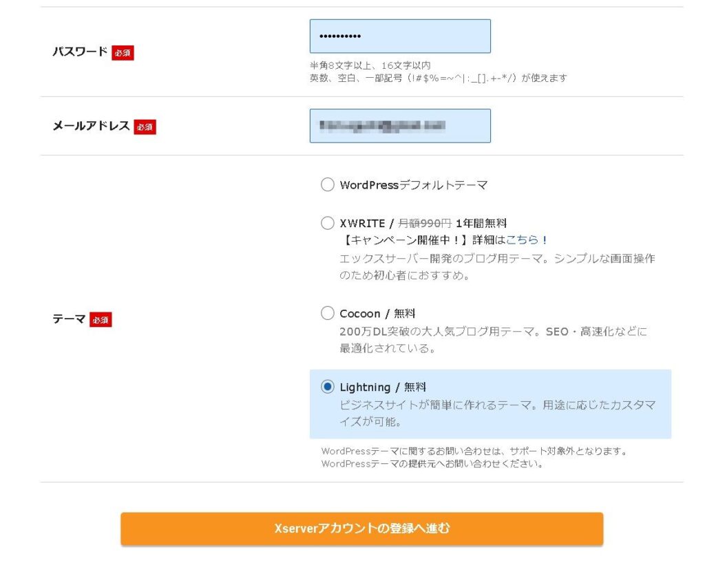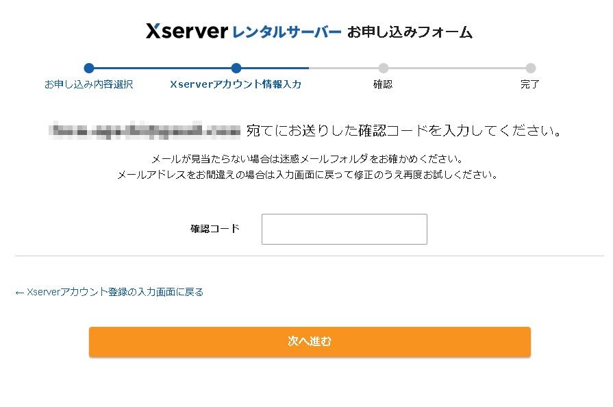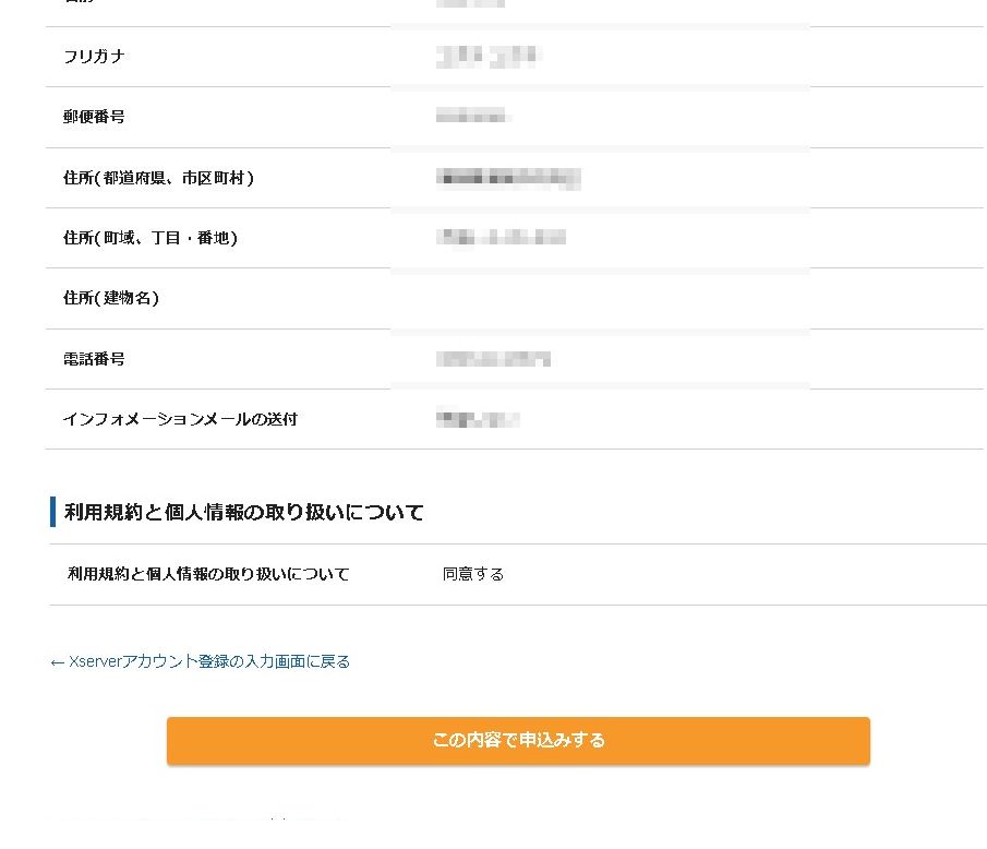 全て入力したら「Xserverアカウントの登録へ進む」で先に進みます。