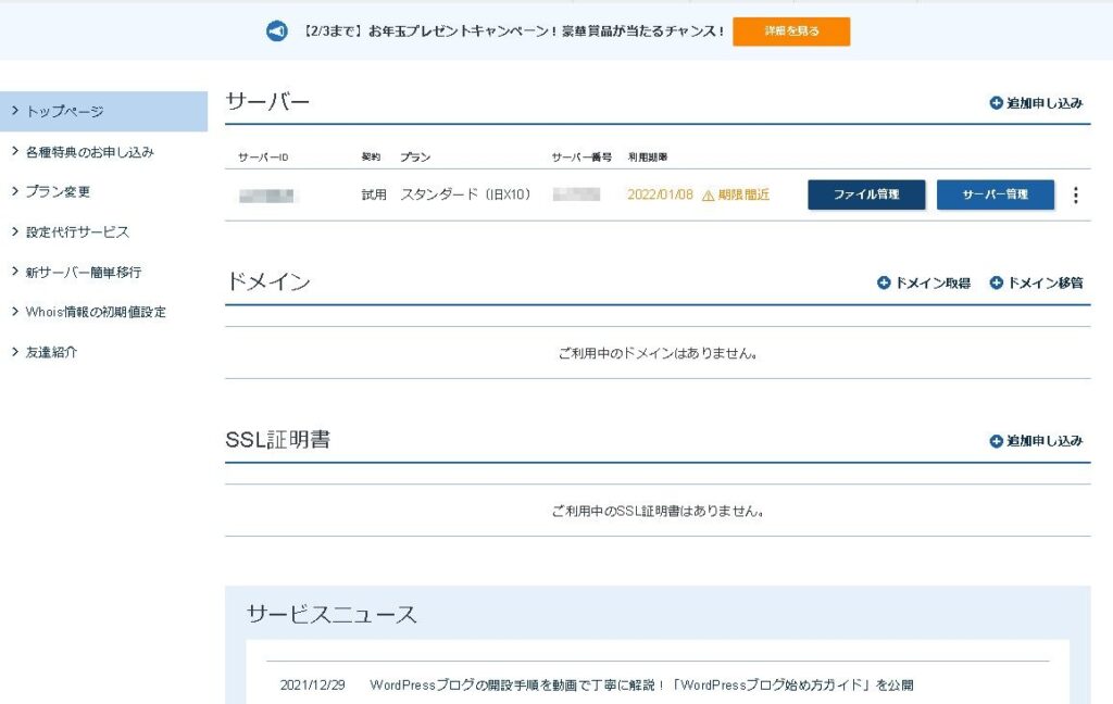 レンタルサーバー管理画面