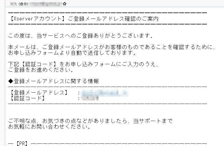 先ほど入力したメールアドレス宛に「【Xserverアカウント】ご登録メールアドレス確認のご案内」といったメールが届いているかと思いますので、本文内の認証コードをコピーします。