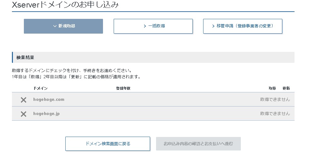 「取得できません」と表示される場合は、既に誰かに取得されているドメインとなりますので他のドメインを検索しましょう。