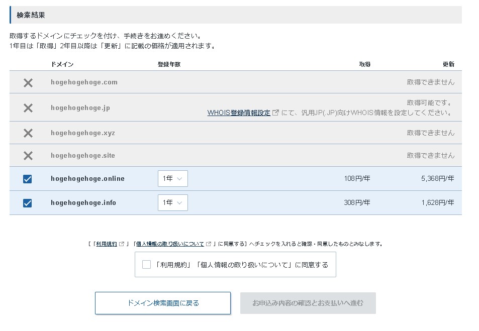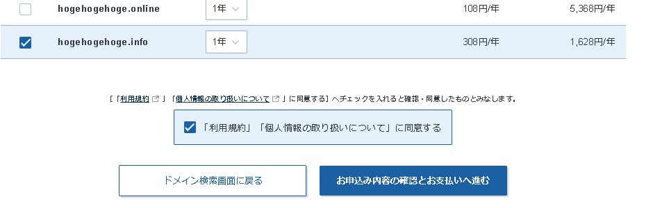 取得できるドメインが見つかったら、取得したいドメインだけにチェックを入れます。※全部チェックが入っていると全部契約になってしまうので注意しましょう。