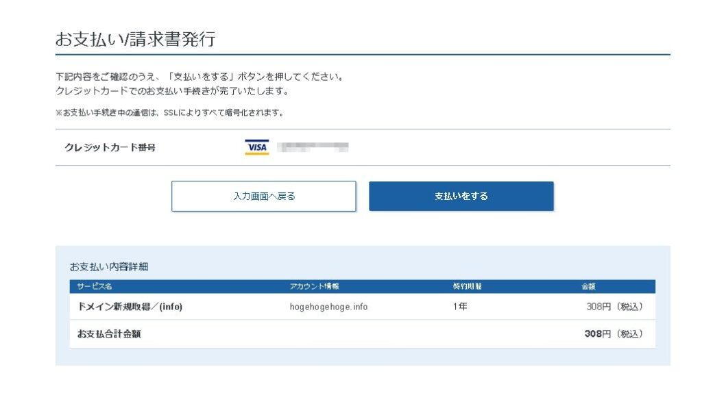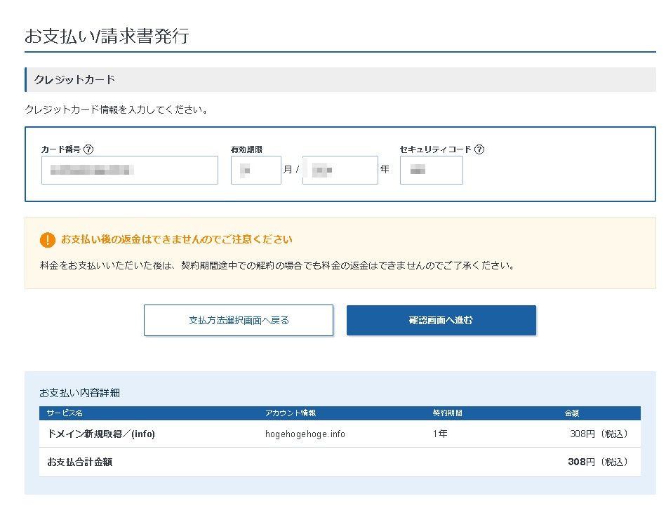 利用規約に同意するのチェックを入れたら、「お申し込み内容の確認とお支払へ進む」からドメインの決済に進みます。