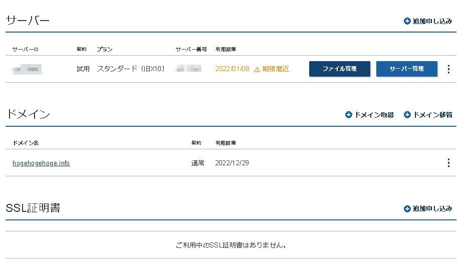 「サーバー管理」と書いてあるボタンを押すと、サーバーパネルと呼ばれる管理画面にログインすることができます