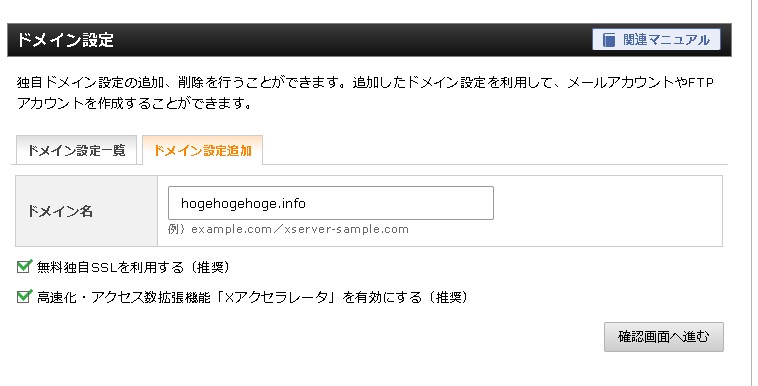 「ドメイン設定追加」から、先ほど取得したドメインを入力して「確認画面へ進む」をクリックします。