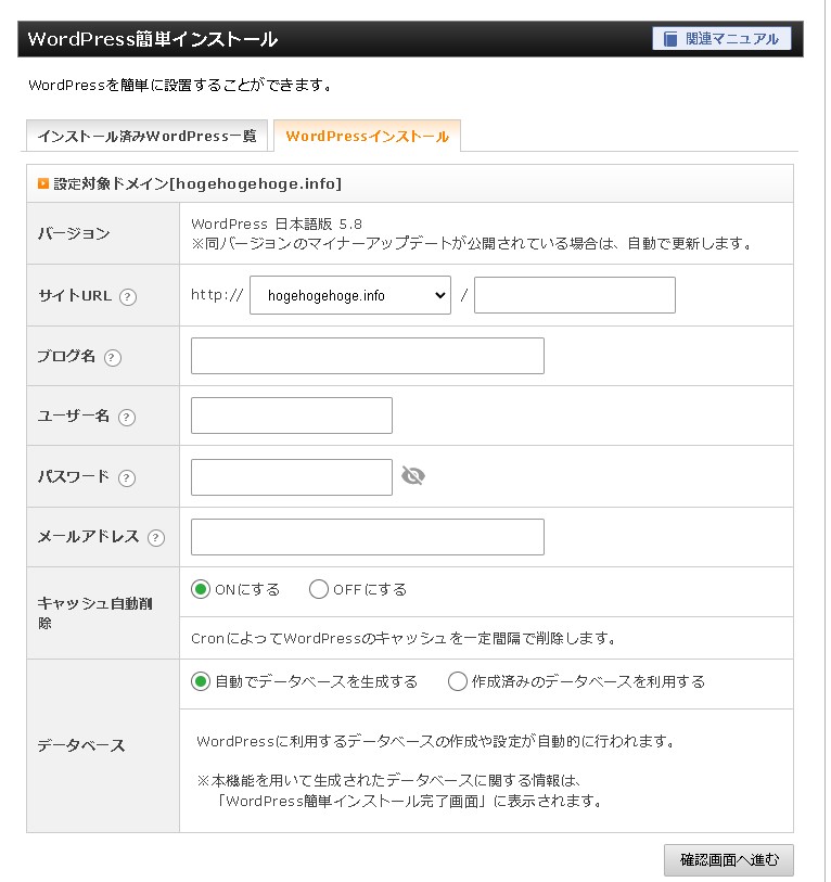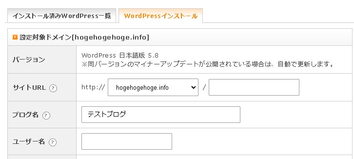 「WordPressインストール」のタブに切り替えたら、設定を行っていきます。