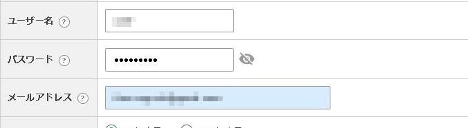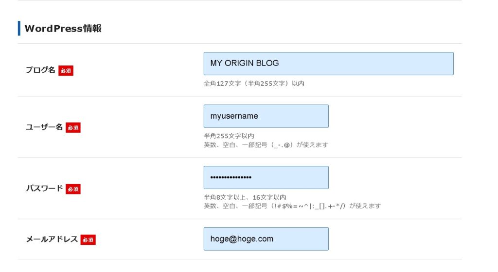 あとは、ブログ名(ホームページ名)、ワードプレスにログインする時の「ユーザー名」「パスワード」「メールアドレス」をそれぞれ設定します。ブログ名は後で変更出来ますので、ひとまず仮の名称でもOKです。