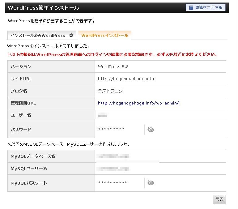 ユーザー名とパスワードはワードプレスにログインする際に使用しますので、忘れないように注意しましょう。