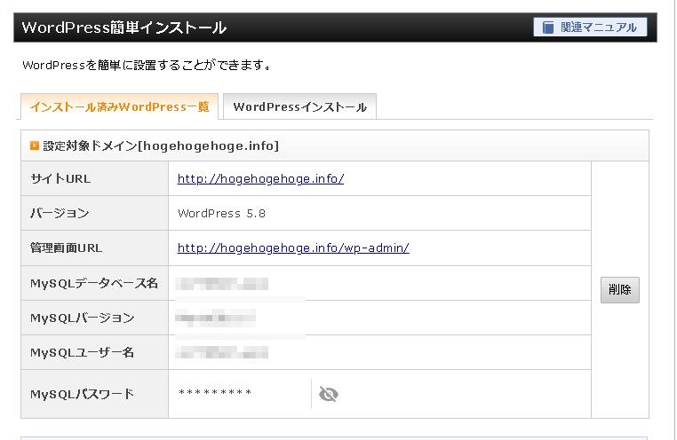MySQLデータベース名、MySQLユーザー名、MySQLパスワードが表示されます。こちらはワードプレスをインストールするデータベースですが、最初の段階では(重要ではありますが)特に使わない情報ではあるので控えなくても大丈夫です。
