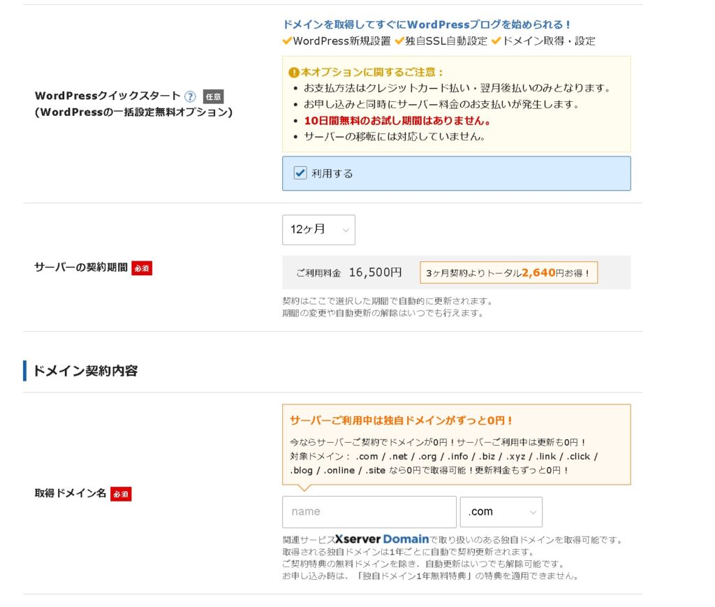 もし、取得したいドメインが決まっている場合は、こちらから取得すると最短でワードプレスサイト設定と作成が完了します。お試し期間無しで手続き完了になりますが、WEBサイトを作ることが確定している場合は、こちらで設定をしてしまった方が早いです。