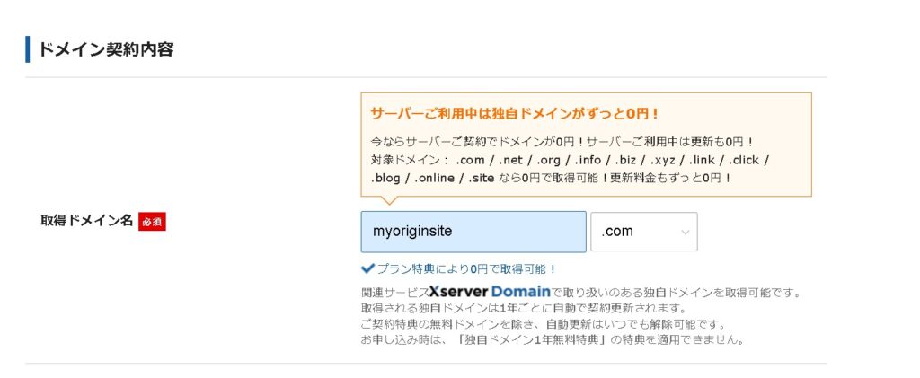 取得したいドメインを入力します。ドメインは希望が無ければ「.com」でも良いかと思います。※ドメインの変更は後で出来ませんので、スペル間違いなど、注意しながら作成しましょう。