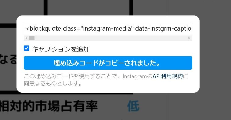 「埋め込みコードをコピー」を押すと、埋め込みコードと呼ばれるページ内に別のページを埋め込めるコードをコピーできます。