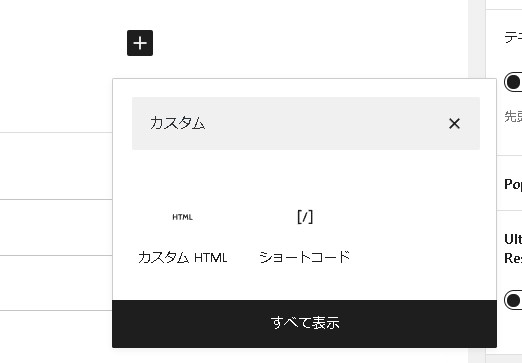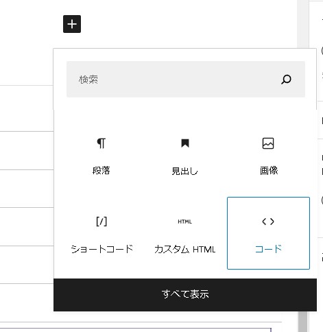 新しいブロックから選択するか、表示されていない場合は「カスタム」「HTML」といった検索キーワードを入れてもらうと出てきます。