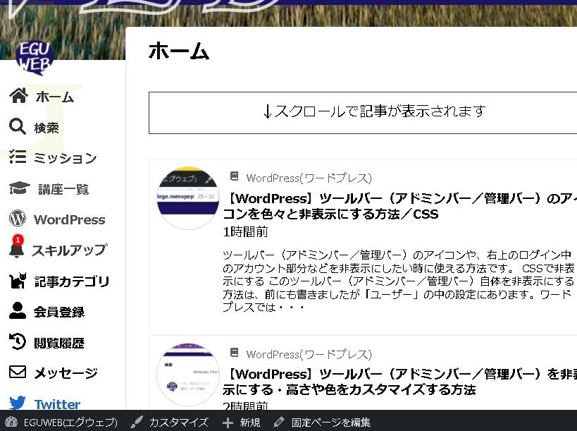 このツールバー(Admin bar)ですが、オリジナルでカスタマイズすると、すこぶる使いやすくなります。例えば、ツールバーを画面の最下部に移動する、使わないアイコンやメニューはCSSで非表示にするなど。