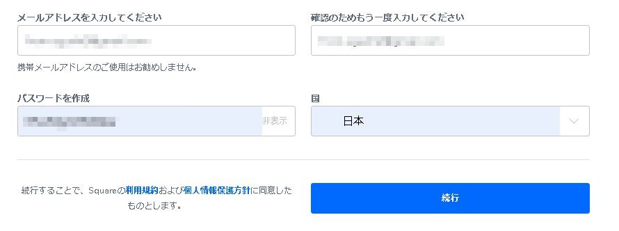 Square(スクエア) アカウントを作成します。まずは、メールアドレス、パスワードを設定します。