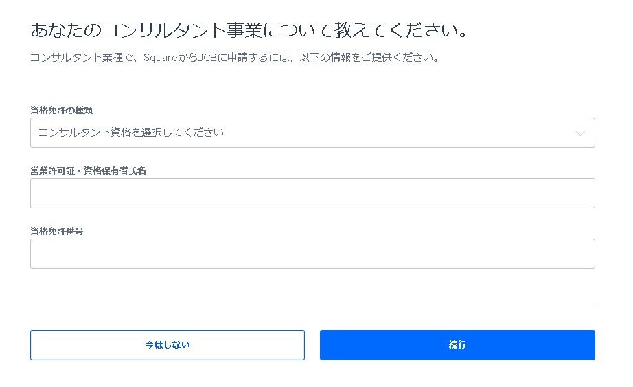 事業内容を入力します。JCBの申請などで必要になりますので、分かるようであれば入力しておきましょう。不明な場合やJCBの申請が後で大丈夫であれば「今はしない」を選択して次に進みましょう。