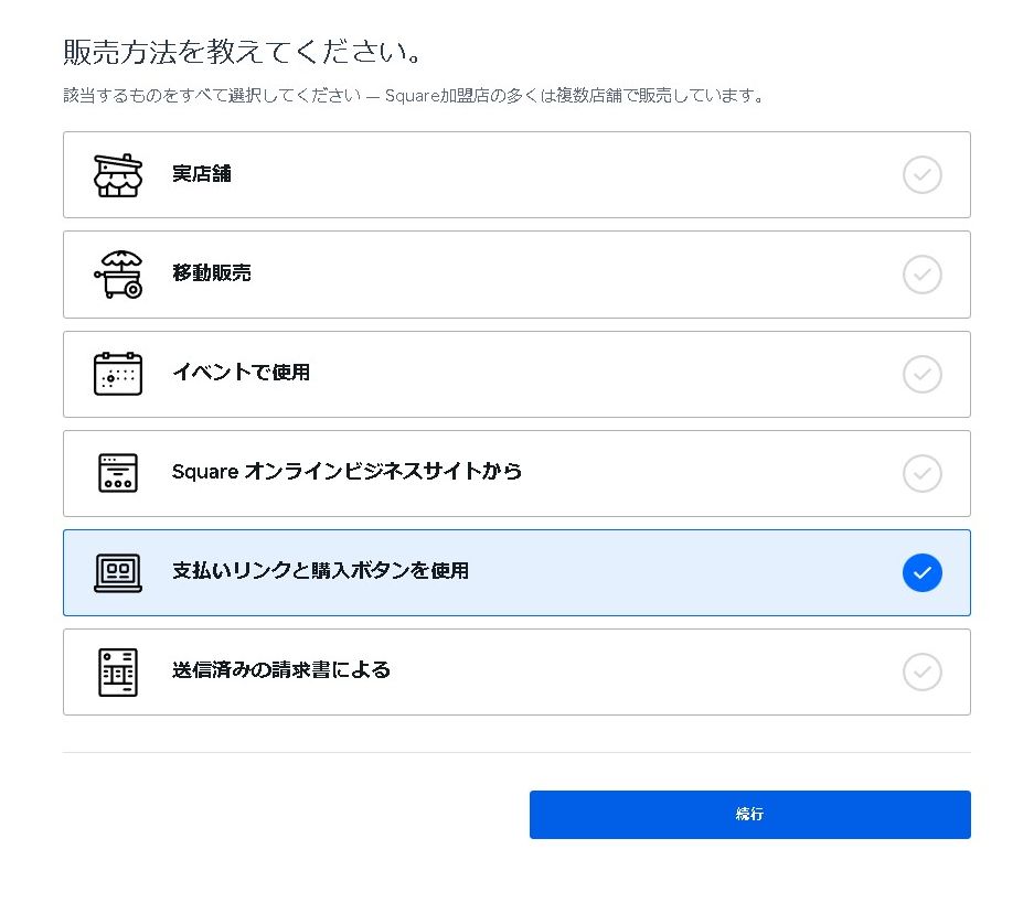 こちらは使用する販売方法を選択します。「支払いリンクと購入ボタンを使用」など、利用するシーンにあった選択をします。