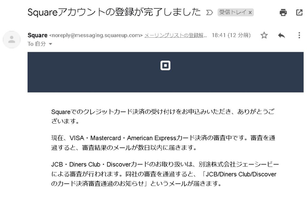 「Squareアカウントの登録が完了しました」というメールも届きます。