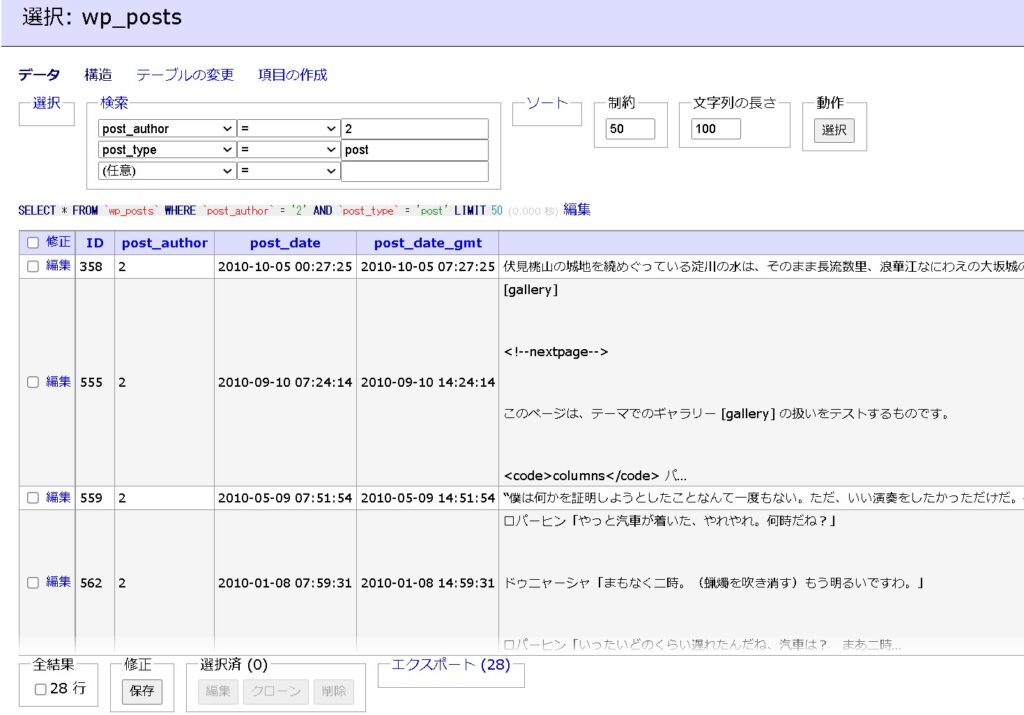 wp_postsテーブル内から、post_author(ユーザーIDと同じ?)が2、post_typeが投稿になっているレコード内のpost_title(投稿タイトル)を抽出して出力します。
