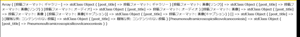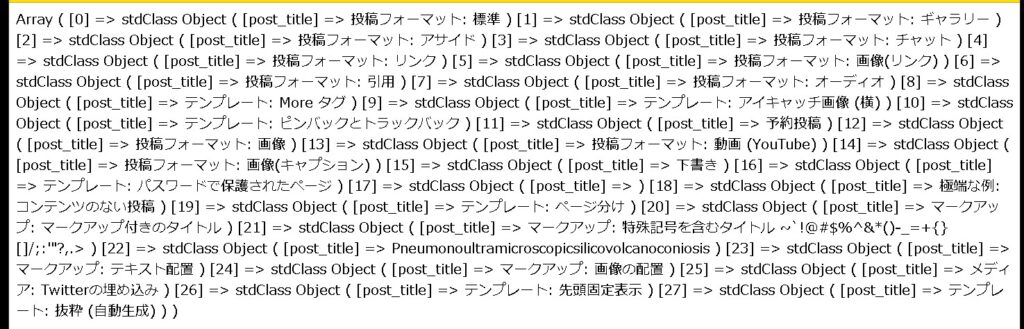 Array ( [0] => stdClass Object ( [post_title] => 投稿フォーマット: ギャラリー ) [1] => stdClass Object ( [post_title] => 投稿フォーマット: 画像(リンク) ) [2] => stdClass Object ( [post_title] => 投稿フォーマット: オーディオ ) [3] => stdClass Object ( [post_title] => 投稿フォーマット: 画像 ) [4] => stdClass Object ( [post_title] => 投稿フォーマット: 画像(キャプション) ) [5] => stdClass Object ( [post_title] => ) [6] => stdClass Object ( [post_title] => 極端な例: コンテンツのない投稿 ) [7] => stdClass Object ( [post_title] => Pneumonoultramicroscopicsilicovolcanoconiosis ) )