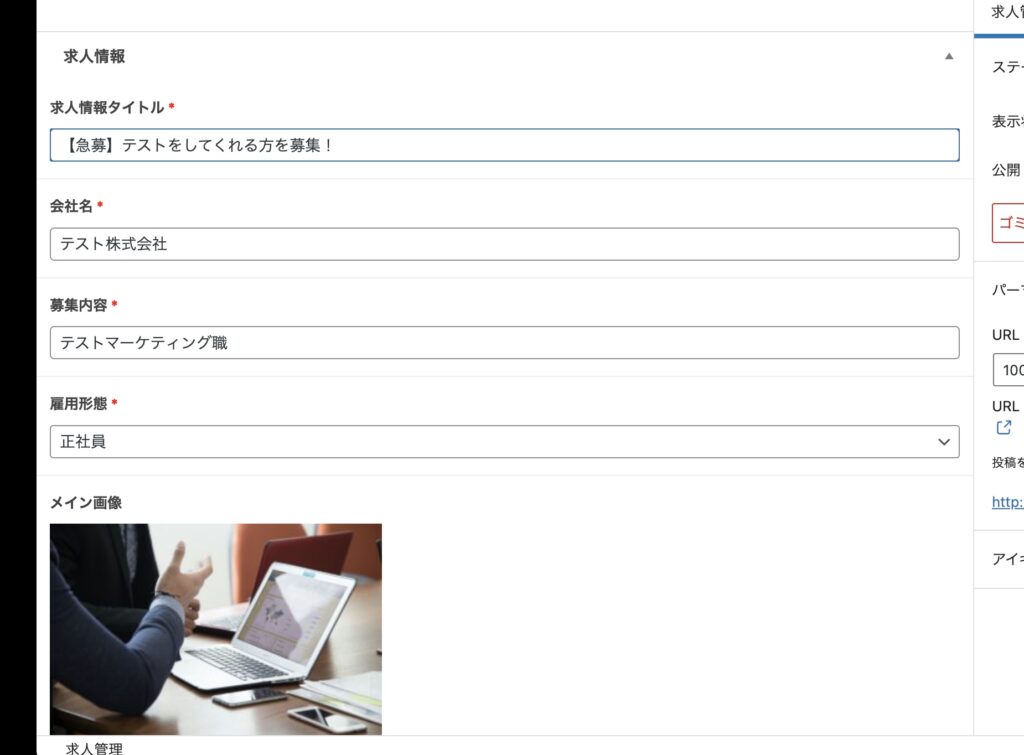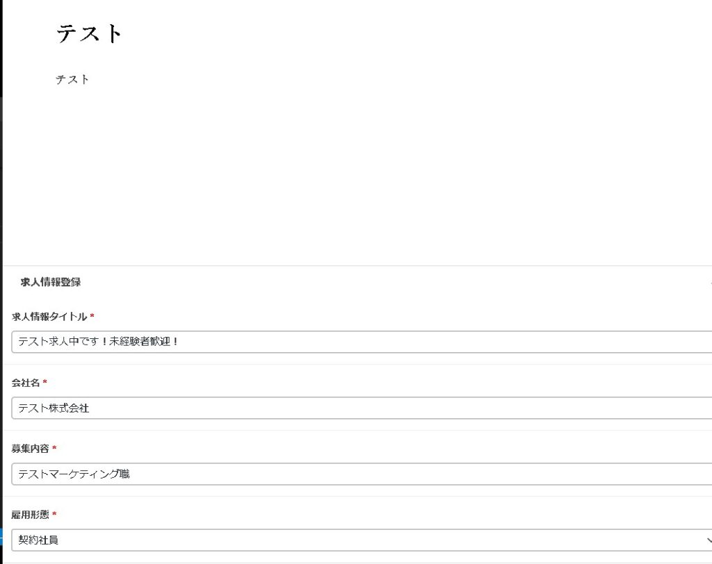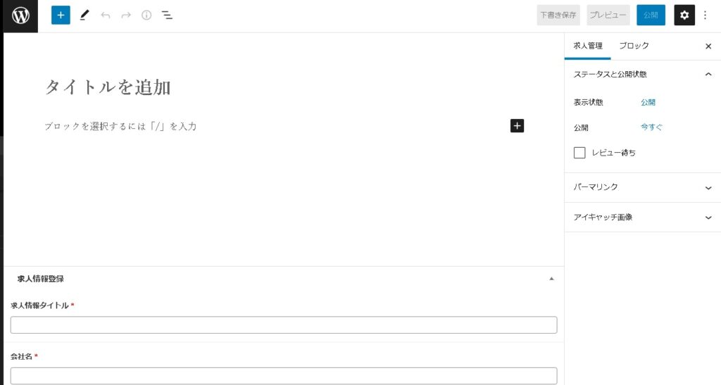 カスタム投稿タイプが「求人管理」の新規作成や編集画面を開いた時には、カスタムフィールドが表示されています。